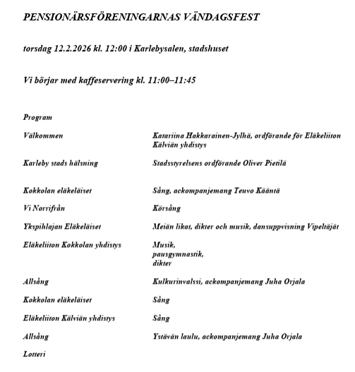 Karleby äldre- och handikappråd bjuder in till den traditionella vändagsfesten på stadshuset, torsdag 12 februari kl. 11.00. Kaffe mellan 11.00-11.45 och festprogrammet börjar kl. 12.00. Pensionärskören Vi Norrifrån uppträder. VÄLKOMMEN !