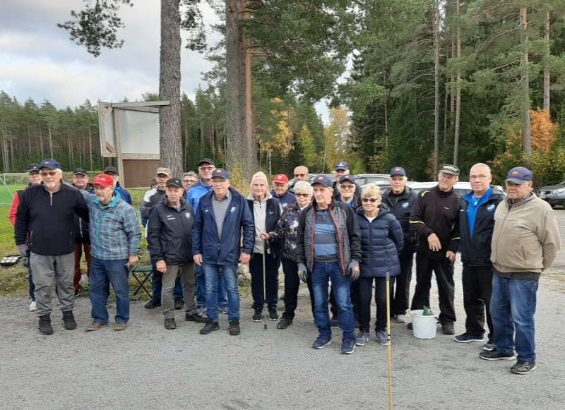 Bildtext: Pensionärerna från Esse och Karleby tog mått av varandra i en ädel kamp den 29 september. Esselagen var svårslagna och visade att de främsta boulespelarna i Österbotten finns i Esse. Här poserar de båda lagen tillsammans efter avslutad kamp. (Ole Granholm)
