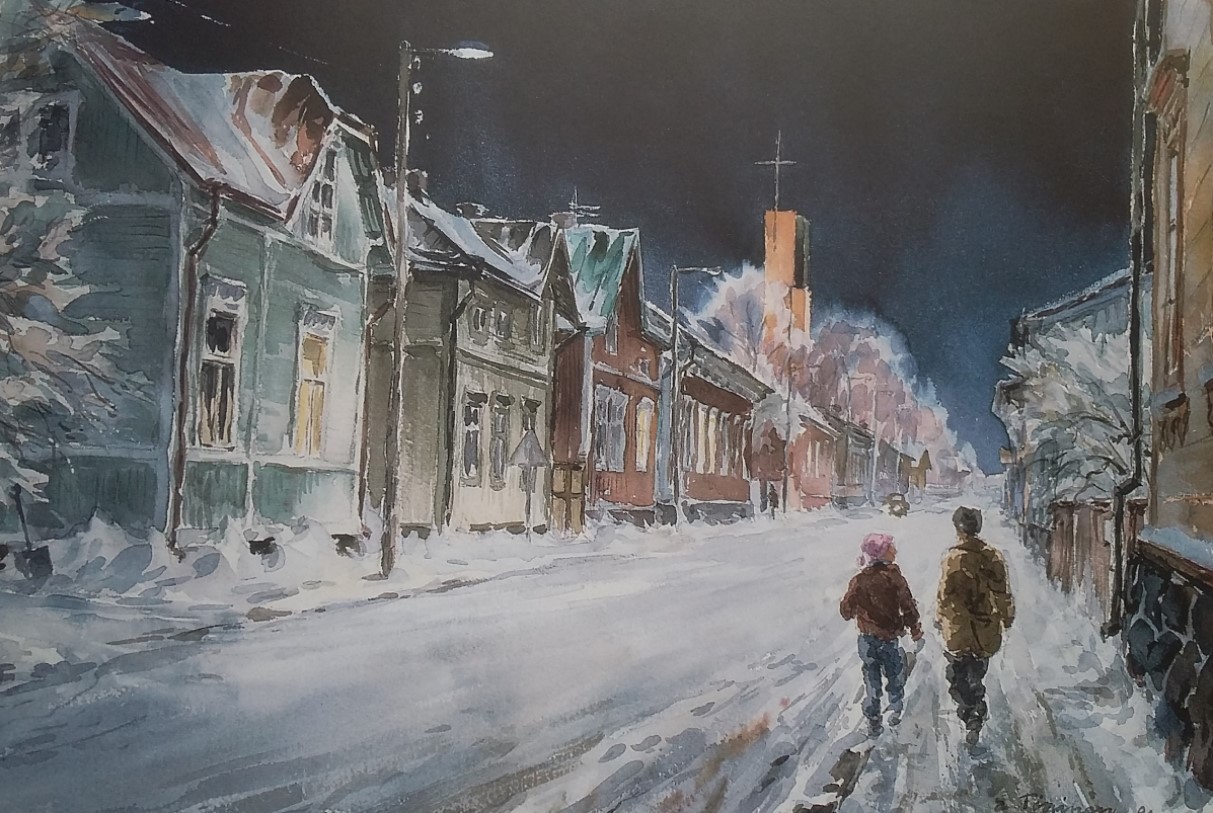 Akvarell av Esa Tiainen - Västra Kyrkogatan i vinterskrud