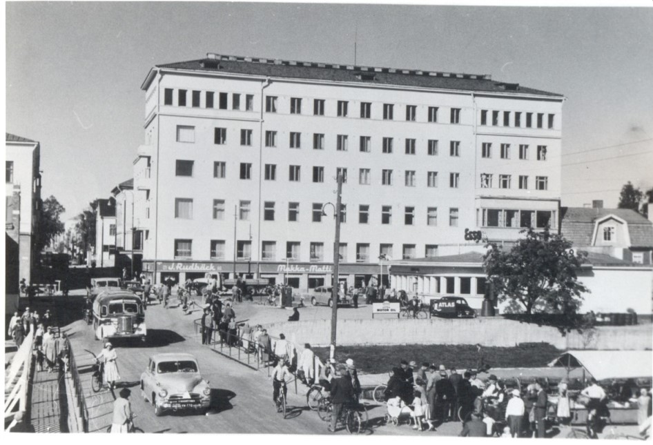 Societetshuset, Rudbäcks, Mokka-Motti och Takalas Essso. Onni Långsveds buss på väg från Yxpila och V.Suomelas skolbil Pobeda lär ut körning med automobiler.